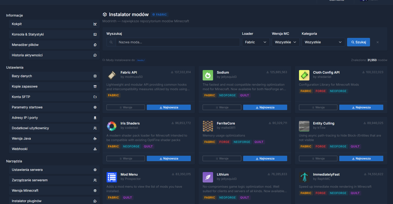 Zainstaluj popularne modpaki Minecraft jednym kliknięciem! RLCraft, SkyFactory 4, FTB Academy, All The Mods i setki innych dostępne bezpośrednio z panelu. Automatyczna konfiguracja, aktualizacje i kompatybilność serwera z modami. Stwórz serwer modded Minecraft w mniej niż 5 minut.
